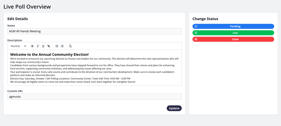- Edit Poll Details: Update the title, description, or custom URL if any changes are needed.